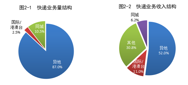 1月份,同城、異地、國際/港澳臺快遞業(yè)務(wù)量分別占全部快遞業(yè)務(wù)量的10.5%、87.0%和2.5%;業(yè)務(wù)收入分別占全部快遞收入的6.2%、52.0%和11.0%。與去年同期相比,同城快遞業(yè)務(wù)量的比重下降1.7個百分點,異地快遞業(yè)務(wù)量的比重增長1.0個百分點,國際/港澳臺業(yè)務(wù)量的比重增長0.7個百分點。